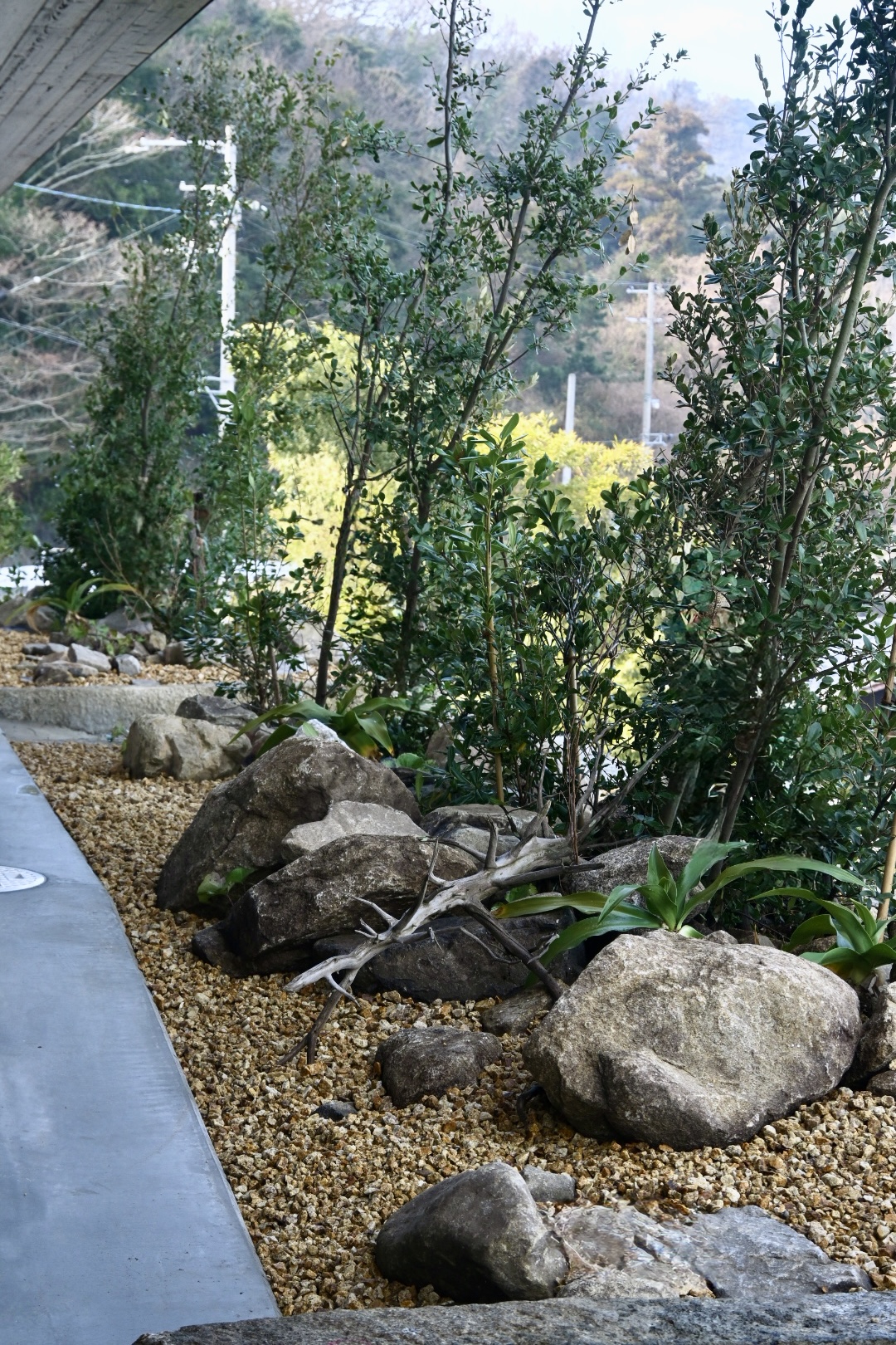 ウバメガシは一本立ちの若木を寄せ植えし、自然の姿に習った植栽としています。