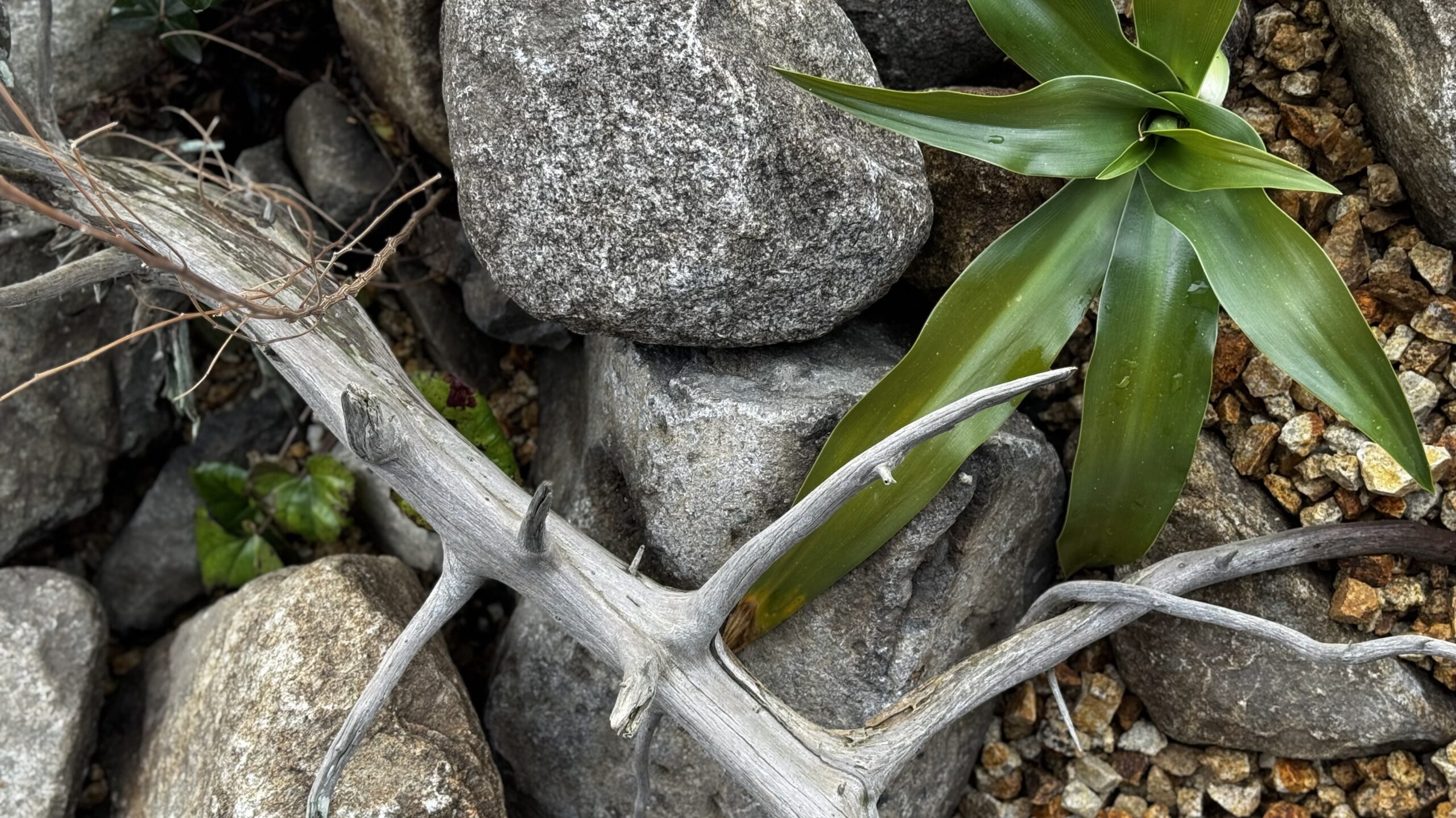景石には安山岩と花崗岩の二種類の石を用い、半島沿岸の風景を庭の中に表現しました。