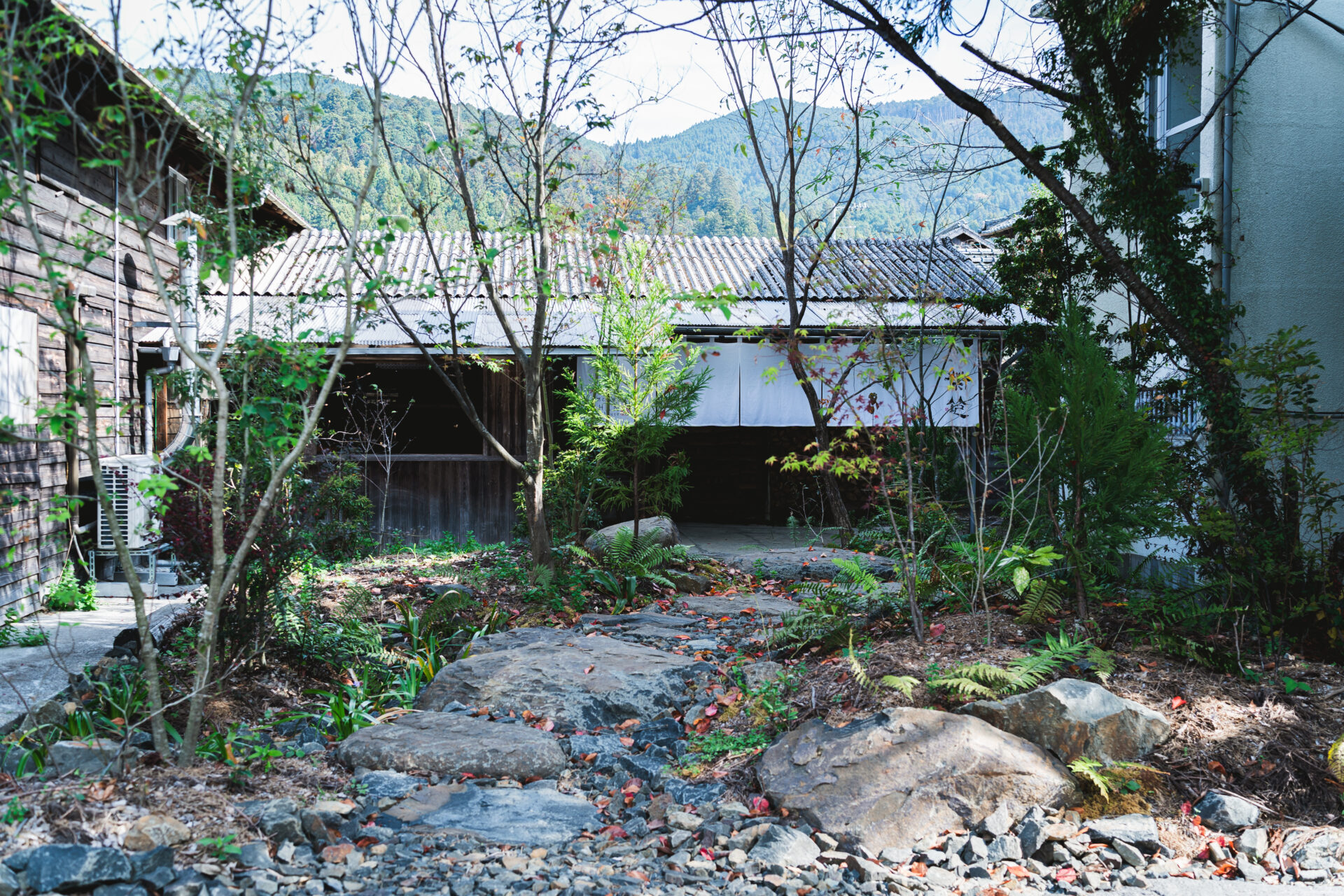 既存の樹木や建物を生かすように、久万高原町にある植物や石を取り入れた空間。